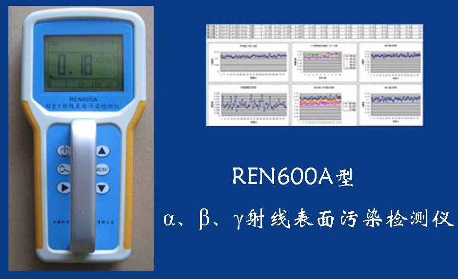 REN600A 表面沾污檢測(cè)儀REN600A型α、β、γ射線表面污染檢測(cè)儀即可檢測(cè)α、β、γ射線,也能檢測(cè)到X射線,它采用高速嵌入式微處器作為數(shù)據(jù)處理單元,點(diǎn)陣式大屏幕LCD液晶顯示,讀數(shù)清晰、操作方便,具有400條超大容量數(shù)據(jù)存儲(chǔ)。儀器采用進(jìn)口的大面積MICA蓋革探測(cè)器,具有較高探測(cè)效率,可進(jìn)行α、β輻射表面污染檢測(cè)和X、γ輻射劑量率的監(jiān)測(cè)。此外通過配套的RenriCont表面污染管理軟件可將存儲(chǔ)的數(shù)據(jù)讀出后分析。可廣泛用在制藥廠、實(shí)驗(yàn)室、發(fā)電廠、進(jìn)出口商檢、采石場(chǎng)、環(huán)境實(shí)驗(yàn)室、環(huán)境污染調(diào)查、核安全應(yīng)急、緊急狀況營(yíng)救站、金屬處理廠、地下油田、供油管道裝備、醫(yī)院核醫(yī)學(xué)科、同位素實(shí)驗(yàn)室、環(huán)境保護(hù)和警察局等部門。REN600A型α、β、γ射線表面